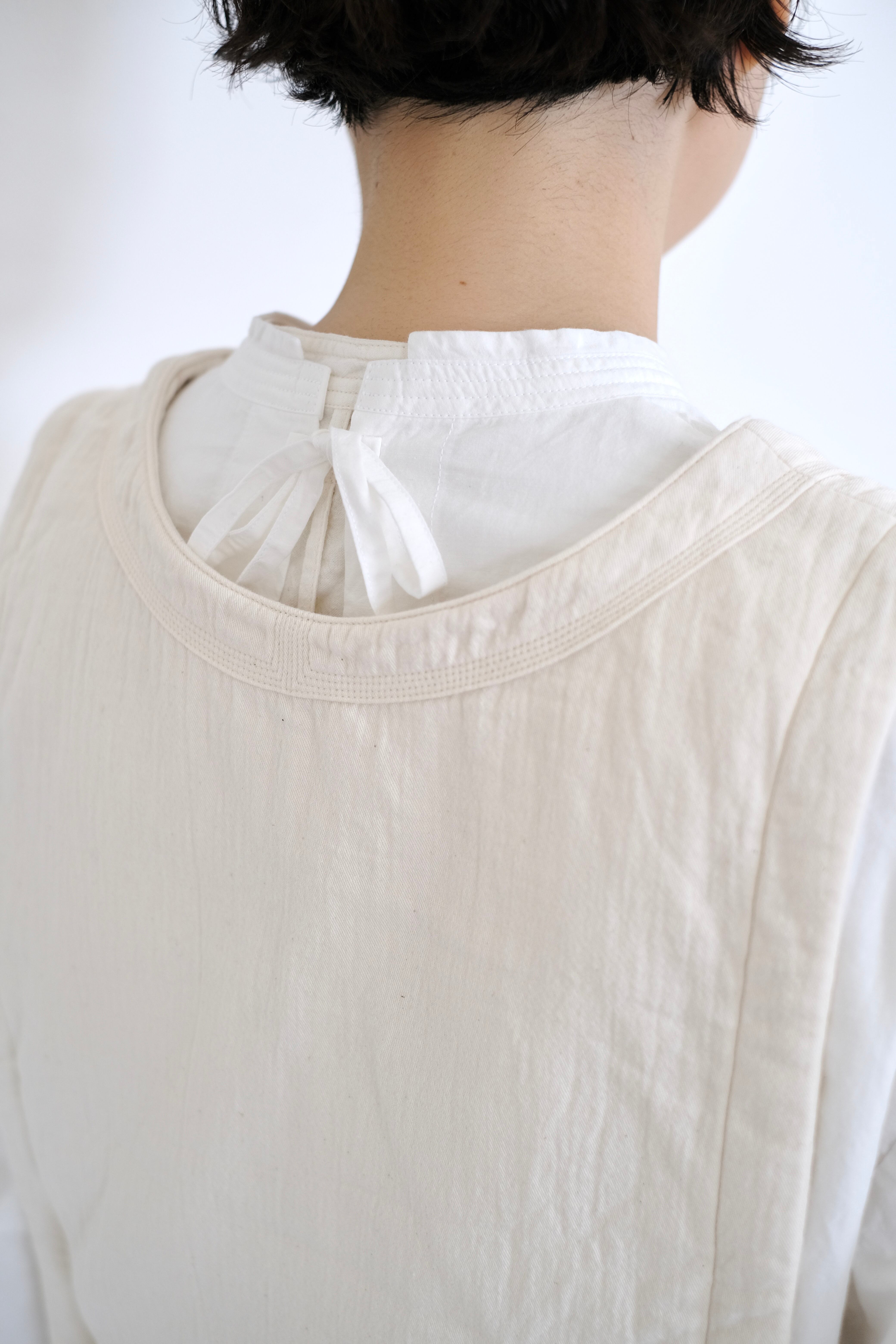 前と後ろで細かなステッチを施した襟が特徴的で、